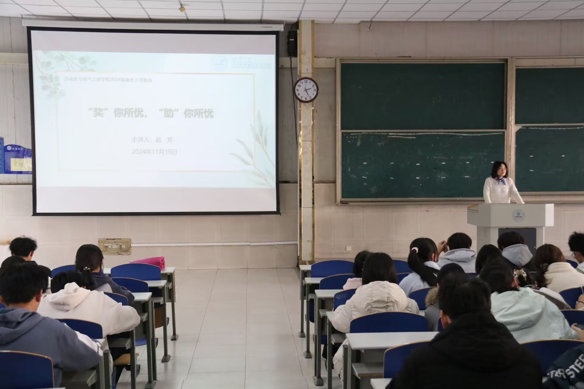 11月19日下午,公司资助工作负责人赵芳以《“奖”你所优,“助”你所忧》为题面向2024级新生开展入学教育,进行奖助政策宣传。