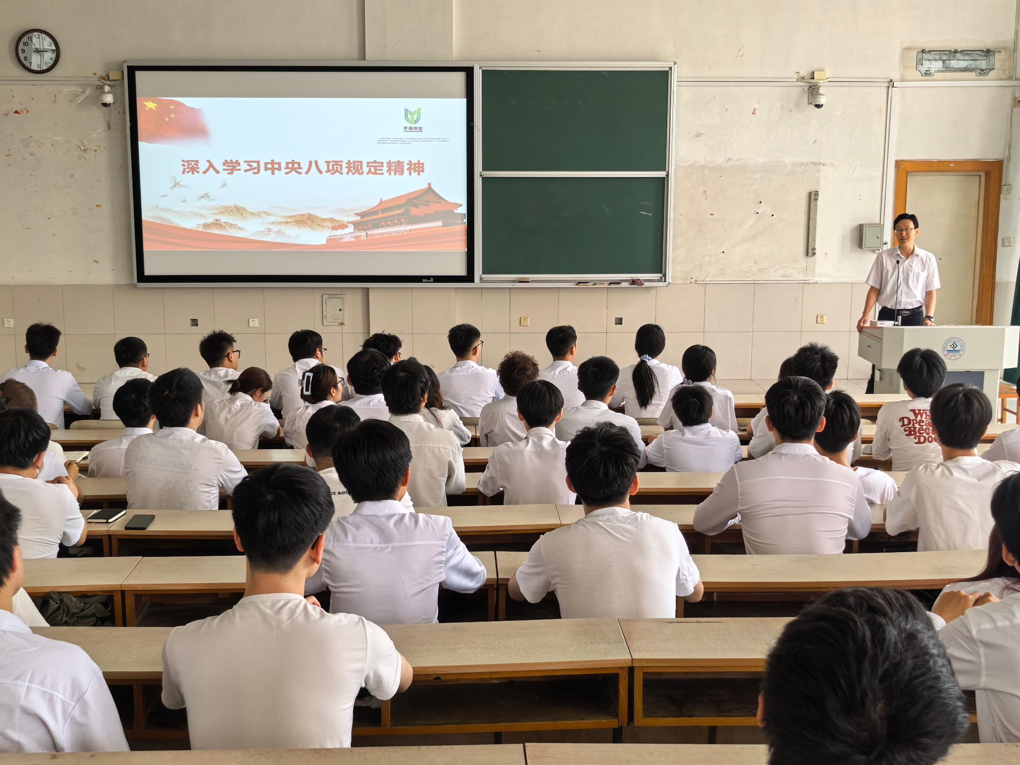 李祥印以《深入学习贯彻中央八项规定精神》为题,从为何开展中央八项规定精神学习教育、怎样开展中央八项规定精神学习教育、八项规定精神何以改变中国、中央八项规定与中央八项规定精神等四个方面展开,以党的作风建设与自我革命的内在联系为逻辑主线,结合习近平总书记关于加强党的作风建设的重要论述,系统阐述了党的作风建设的重要性、中央八项规定精神的核心要义。李祥印勉励毕业生党员要牢记底线红线、增强自律意识,自觉遵守廉政准则,切实筑牢思想防线,永葆共产党人清正廉洁的政治本色。