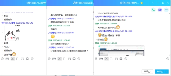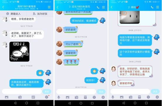 平台所面向的非电专业员工数目庞大,均为大学二年级员工,绝大多数是第一次接触仿真,软件的学习使用过程存在较大困难,对虚拟教学工作的开展是极大的挑战。除了保障网络平台运行外,实验中心教师克服各种不利因素,昼夜答疑,培训课代表辅助教学。方会老师在群内每天回复几百条信息,确保了每一位遇到困难的同学得到正确结果,做好理论课“主播”的“客服”工作。