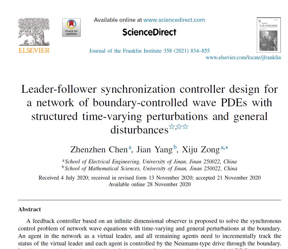 近日,三亿体育在读硕士研究生陈镇镇同学撰写的论文“Leader-follower synchronization controller design for a network of boundary-controlled wave PDEs with structured time-varying perturbations and general disturbances”在Journal of Franklin Institute(《富兰克林研究所杂志》)发表,正式出版是2021年 第一期,第358卷, 834-855。