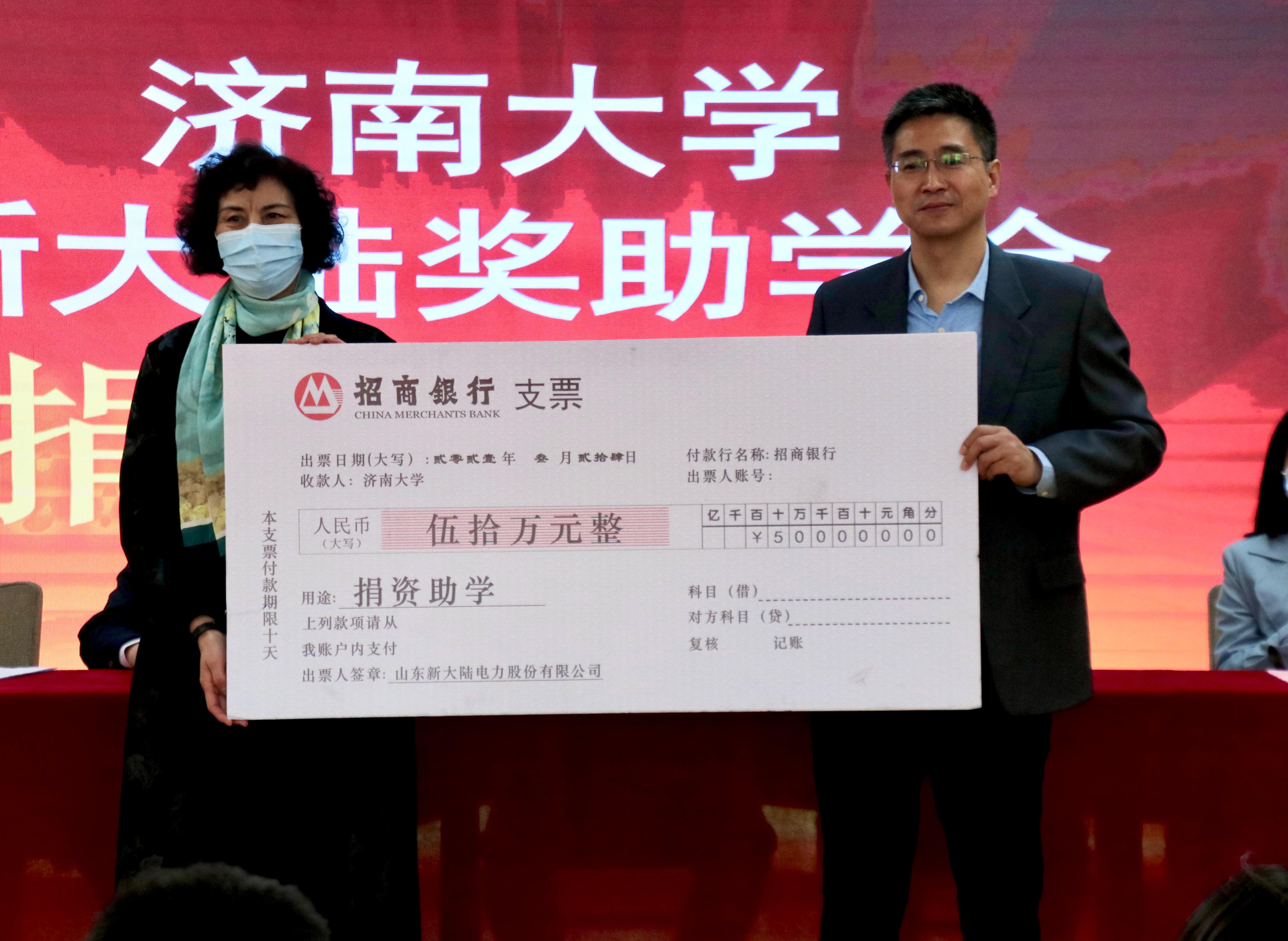 董仁勇副总经理表示,山东新大陆电力股份有限公司是一家有社会责任感的企业,在企业发展过程中,注重回馈社会、奖学助学。企业捐资50万元,在三亿体育官网设立“新大陆电力奖助学金”,希望能够为济大学子带来帮助,为支持高等教育事业发展做出贡献;希望济大学子志存高远,奋发图强,安心投入到学习中,在火热的青春中放飞人生梦想;也希望济大学子毕业后,用自己的能力回馈社会,不辱历史赋予的使命,不负全社会的期望,为国家、为中华民族的伟大复兴贡献一份力量。