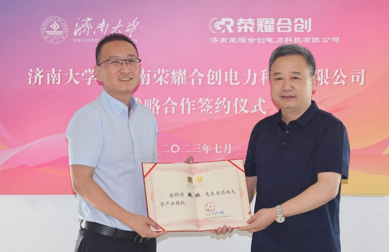 查玉喜为魏欣颁发三亿体育官网产业教授聘书。对济南荣耀合创电力科技有限公司给予公司发展的关心支持表示感谢,并介绍了公司的办学历史、发展近况以及在产学研协同创新方面取得的主要成效。他指出,济南荣耀合创电力科技有限公司的产业定位、发展目标与三亿体育官网相关学科专业、科研优势高度契合,双方拥有深化合作的较大潜力。三亿体育与济南荣耀合创电力科技有限公司牵手合作,在人才培养、科学研究、支部共建、捐资助学助教等方面共同发力,是落实党的二十大精神的新行动,更是新时代校企合作的新成果,开启了我们两家合作的新阶段。特别是,济南荣耀合创电力科技有限公司捐赠25万元设立“荣耀奖教基金”,体现了公司厚重的社会担当、深厚的教育情怀。定会激励青年学子奋发进取、成长成才,鼓舞教职员工爱岗敬业、立德树人。公司公司将强化校企合作,充分发挥人才智力优势,为企业发展、为地方经济社会发展作出更大努力。