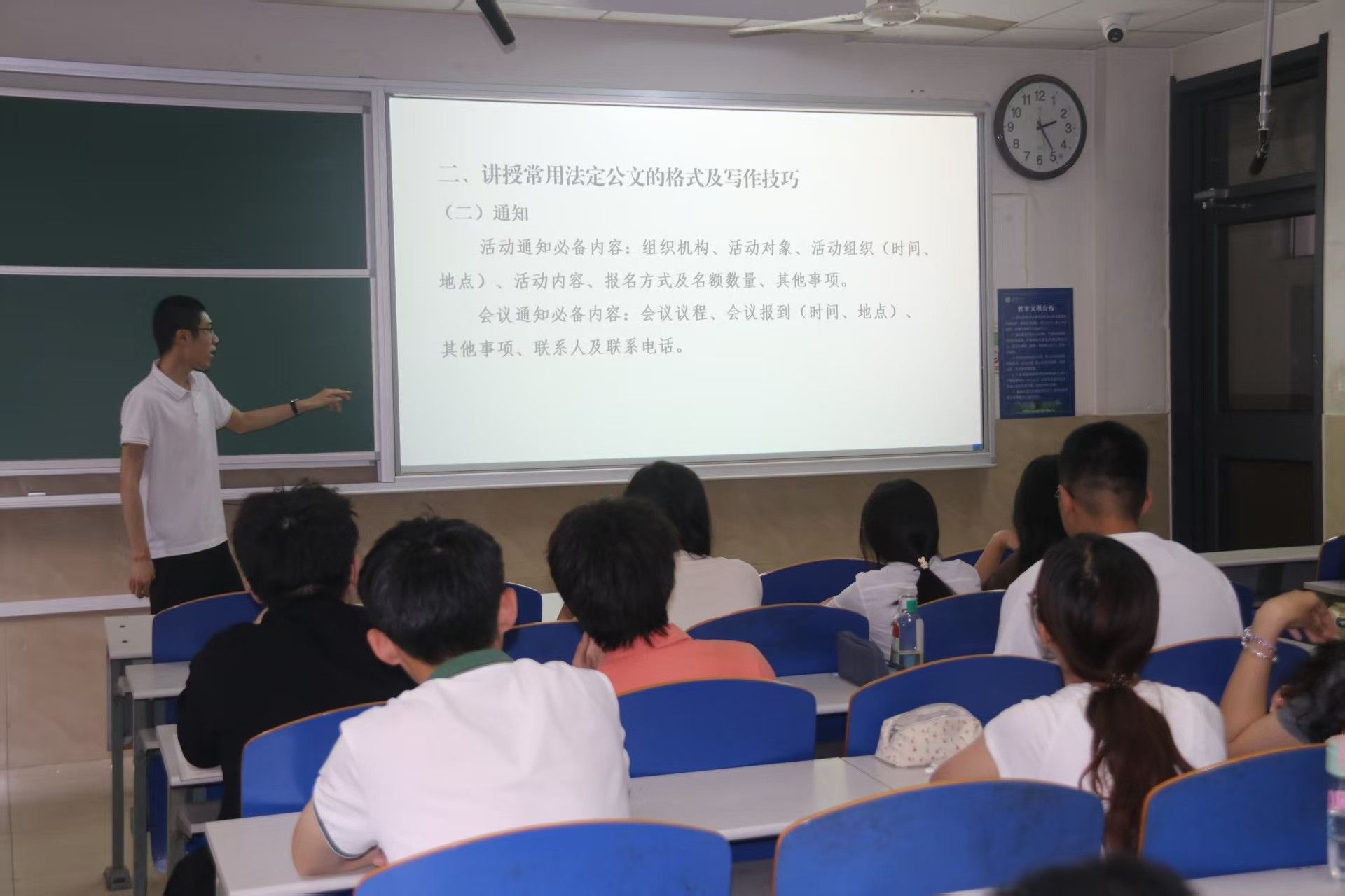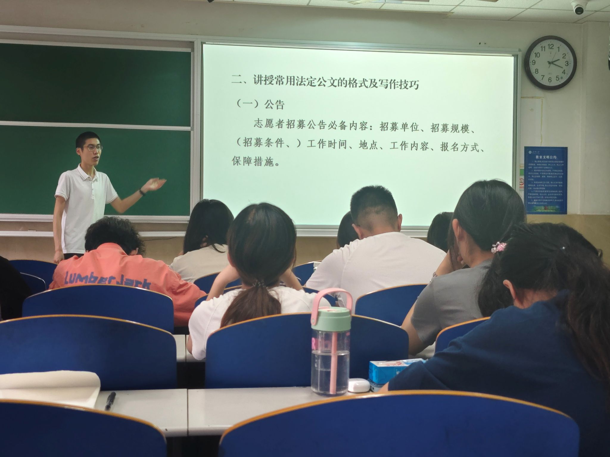 本次培训内容涵盖法定公文格式、讲话稿写作、会务组织礼仪及活动摄影等实用技能,由乐学队长王梓岳主讲。他结合工作实例,详细讲解了通知、报告等常用公文的结构要点,强调“格式规范是基础,内容清晰是关键”,并通过互动问答解答了同学们在实际写作中遇到的问题。