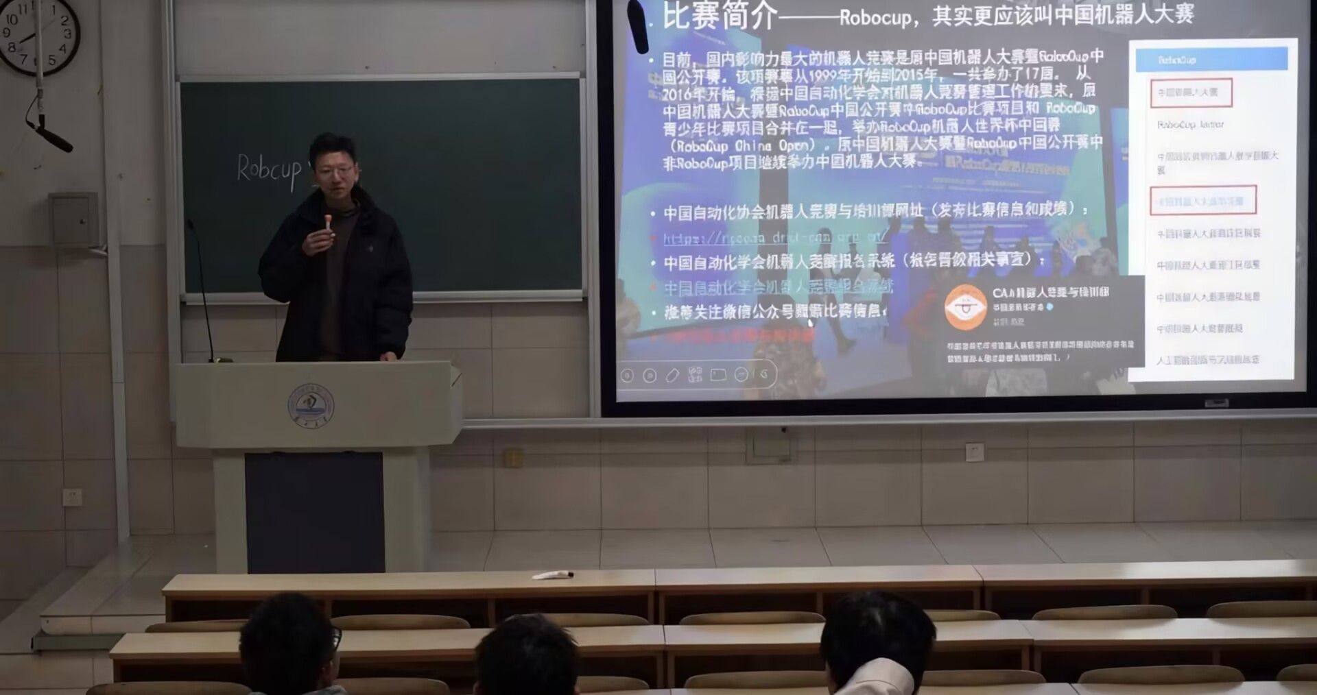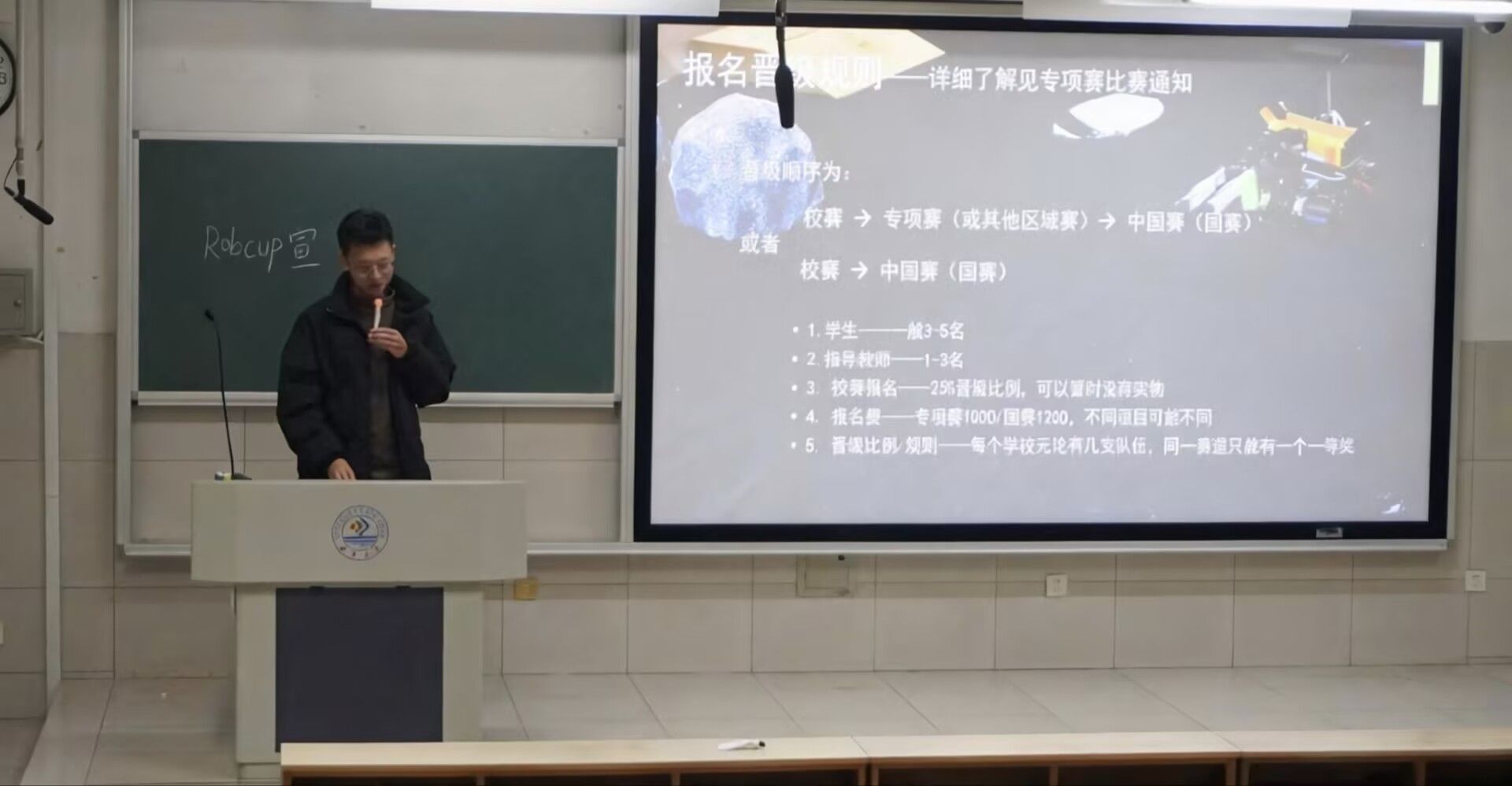 宣讲伊始,宋奇讯结合自身参赛经历,从竞赛背景、赛事分类、核心赛项设置等方面展开介绍,生动阐述了Robcup机器人大赛在培养创新思维、实践能力及团队协作能力中的重要意义,让在场同学对赛事有了全面认知。随后,他聚焦竞赛流程,详细讲解了报名细则、备赛阶段划分、作品打磨重点等关键内容,针对自动化专业学子的知识储备与技能优势,提出了“理论结合实践、精准定位赛项、强化团队协作”的备赛建议。