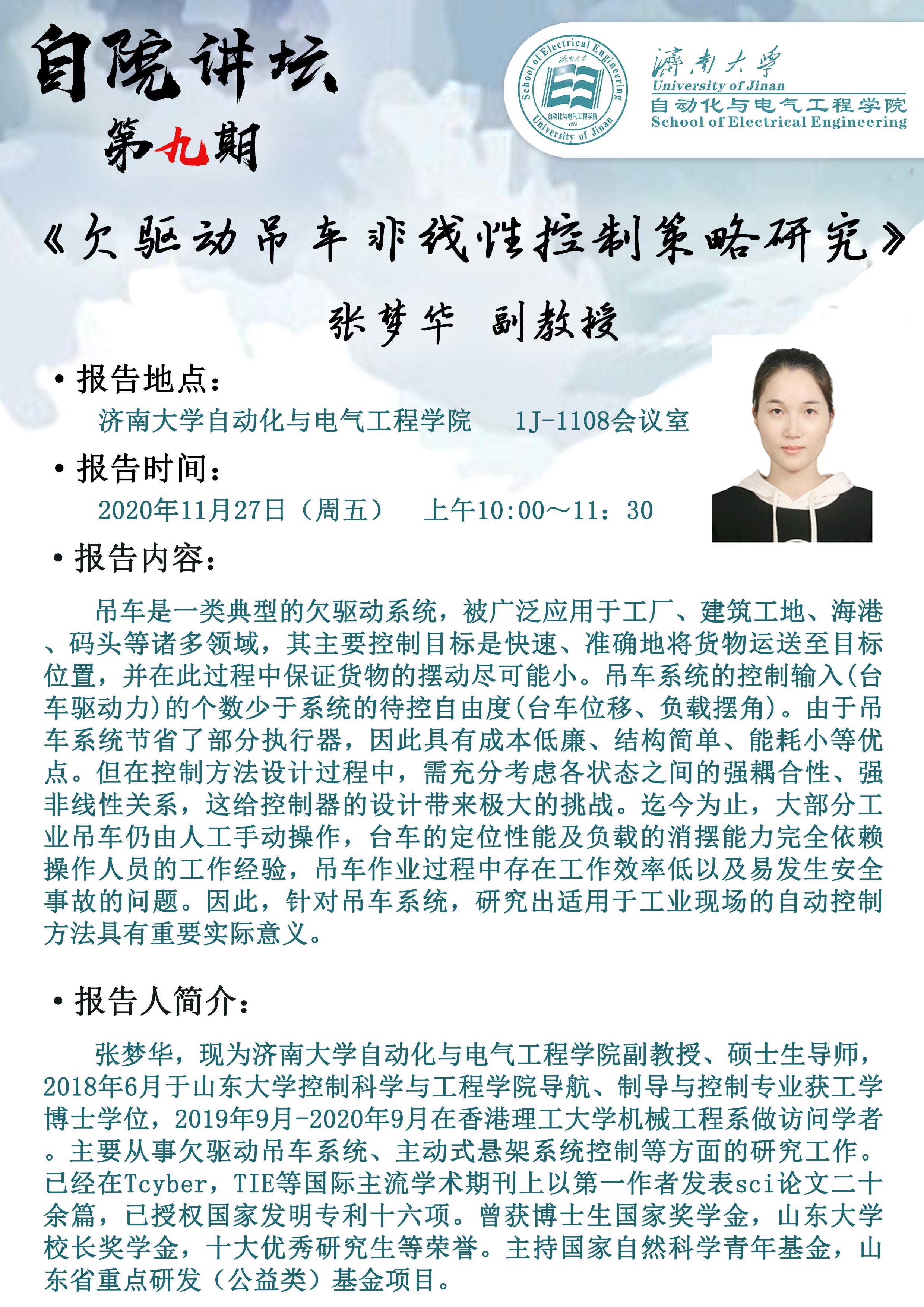 自院讲坛第9期:欠驱动吊车非线性控制策略研究