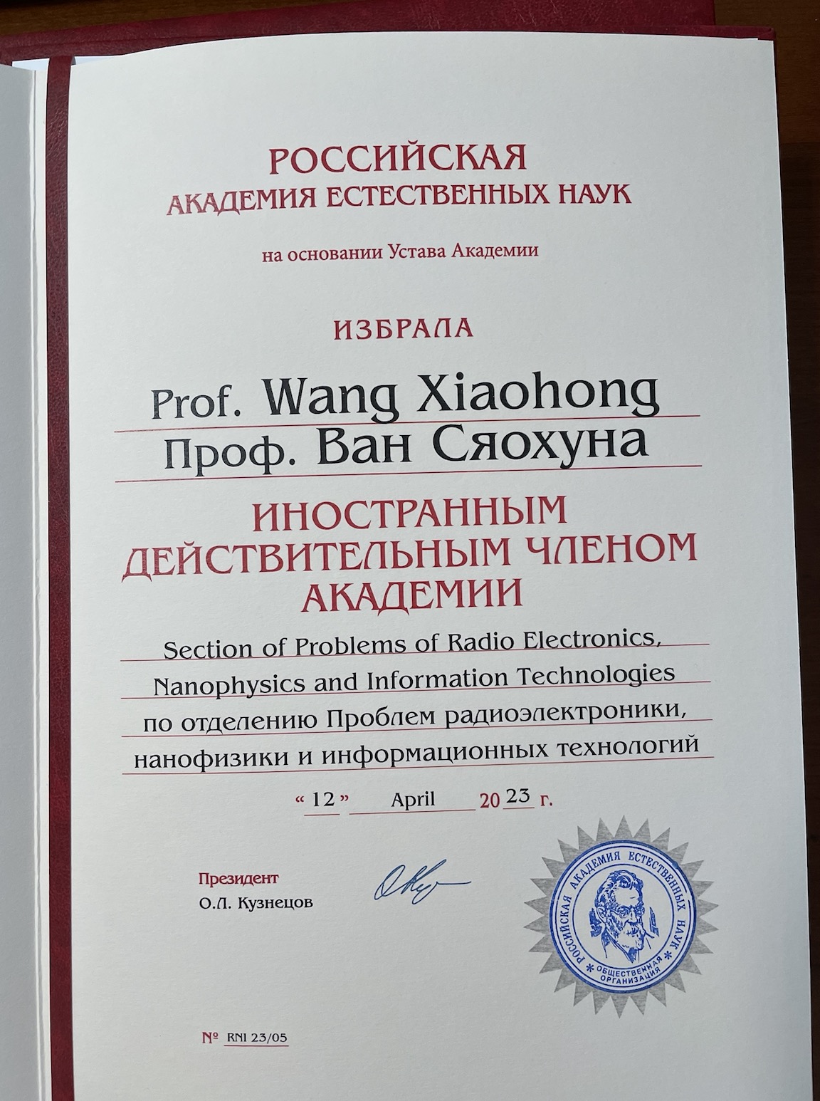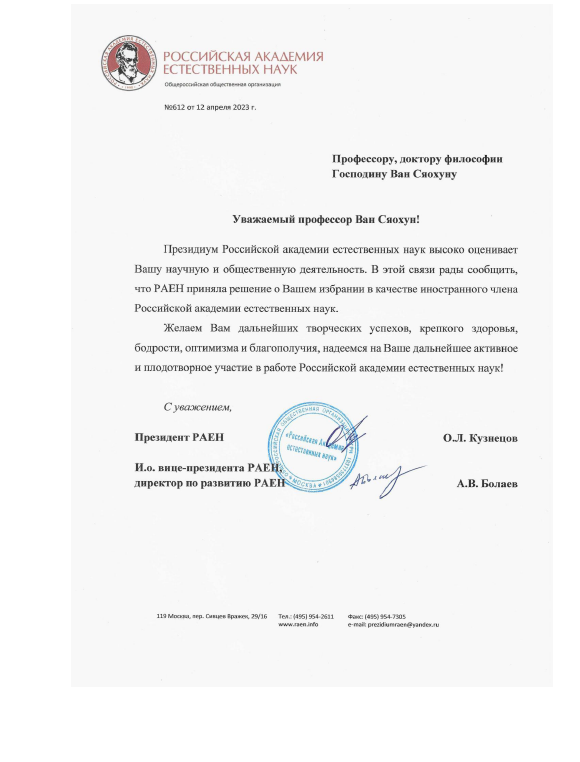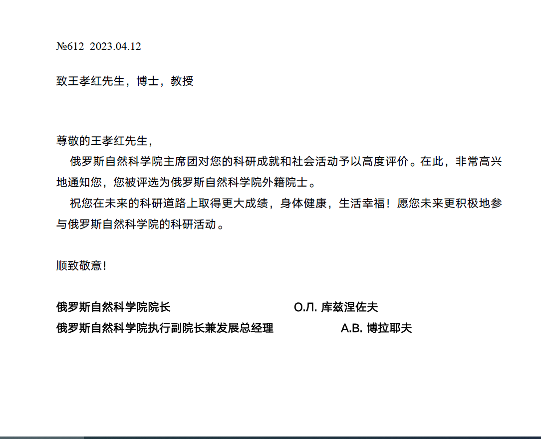 近日,俄罗斯自然科公司通过院士推荐、形式审查、材料审核、学部选举、主席团审议等流程,经严格的学术评审和遴选,三亿体育官网王孝红教授当选俄罗斯自然科公司信息和控制科学学部外籍院士。