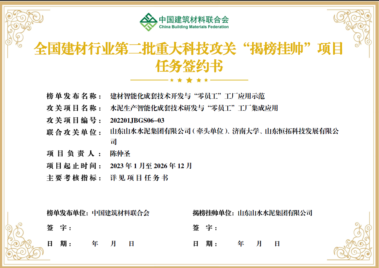 大会同步举行了第二批全国建材行业重大科技攻关“揭榜挂帅”项目签约仪式。公司王孝红教授团队成功揭榜项目2项,分别是与唐山冀东水泥股份有限公司联合的“建材智能化成套技术开发与‘零员工’工厂应用示范”,与山东山水水泥集团有限公司联合的“水泥生产智能化成套技术研发与‘零员工’工厂集成应用”项目。