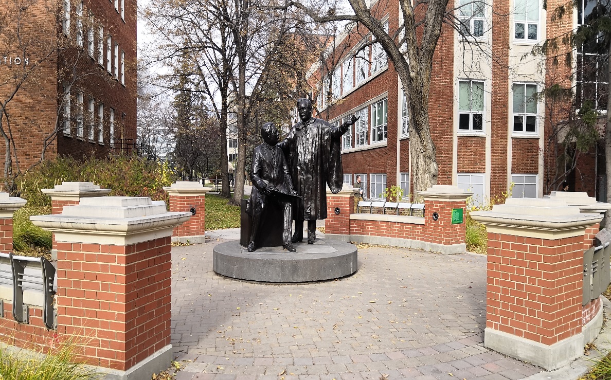Fig.2 阿尔伯塔创始董事长Henry Marshall Tory和时任阿尔伯塔省长在一起筹划公司未来的塑像(周围红墩子之间刻着历任董事长的姓名和任期)